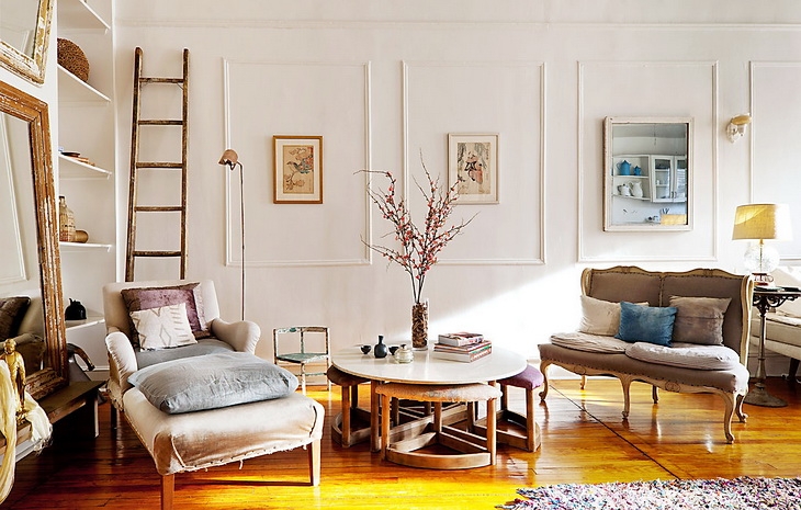 Seemingly a soft cross of industrial, Boho, and traditional elements, the vintage design style recreates the rustic flea market look. Use wooden furniture, with a bit of color peeled off to expose the wood underneath. Accents should have traditional flair with light colors.