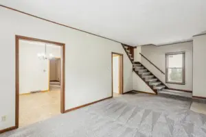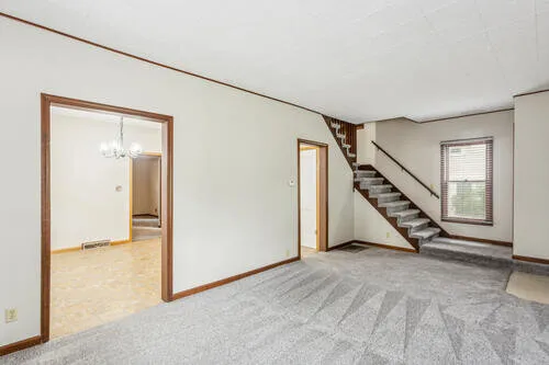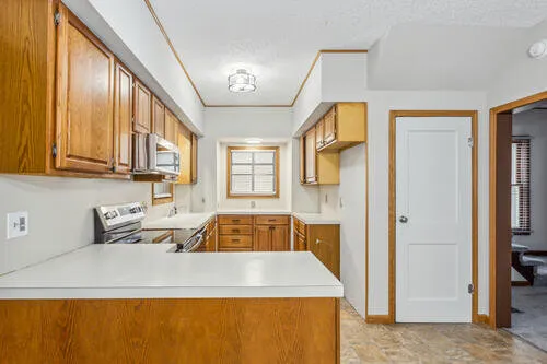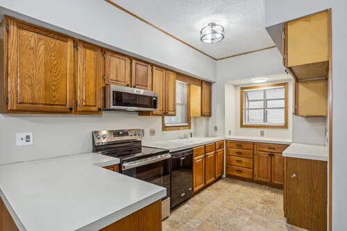 Appeal with a quaint covered front porch that spans the front of the home, perfect for a charming seating area. Step inside to discover new carpet throughout, leading you to a bright and sunny living room that invites relaxation. The kitchen and dining combo is designed for entertaining, featuring plenty of cabinet space and stainless steel appliances, all included for your convenience.