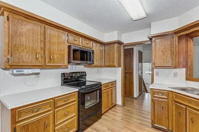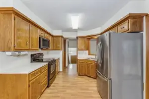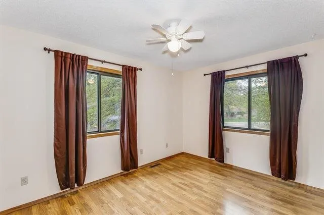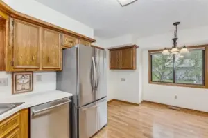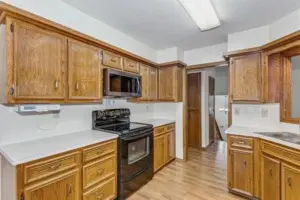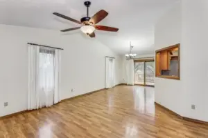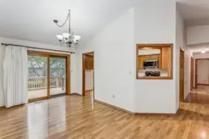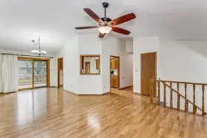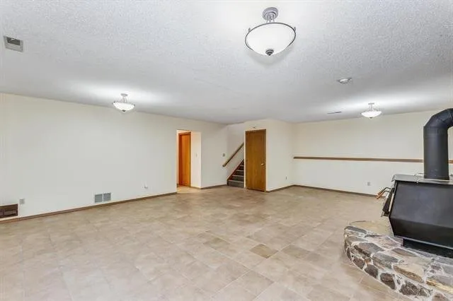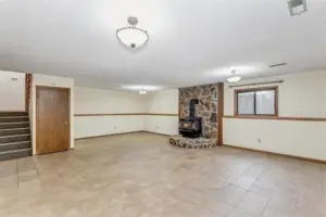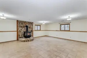 Out front, the curved driveway leads to a huge side-load garage. Step inside the home to find a breezy, open living area under soaring vaulted ceilings. Bright picture windows light up the gleaming wood laminate floors and accentuate the neutral wall colors and warm wood tones throughout the home. The dining room is seated in front of sliding doors that lead out to the back deck, giving you lovely views of the outdoors while you eat or entertain. Into the kitchen, you will love how it’s partially open to the living room with a cut-out wall, making it easy to chat with guests while you make a meal. The kitchen boasts tons of cabinet space and appliances that are included in the home. There’s also a breakfast nook spot where you can enjoy your morning coffee. There are three bedrooms and two baths on the upper level and two bedrooms and a third full bath on the lower level, giving you a great split bedroom plan that also works well for guests. In the basement, the huge family room is centered around a rustic woodburning stove with a floor-to-ceiling stone surround, making this the perfect backdrop for holiday gatherings with family or friends. This home has so much space to enjoy. It’s also located close to EVERYTHING, including shopping, restaurants, Rock River Rapids Aquatic Park, several parks, quick highway access via K-15, and so much more.