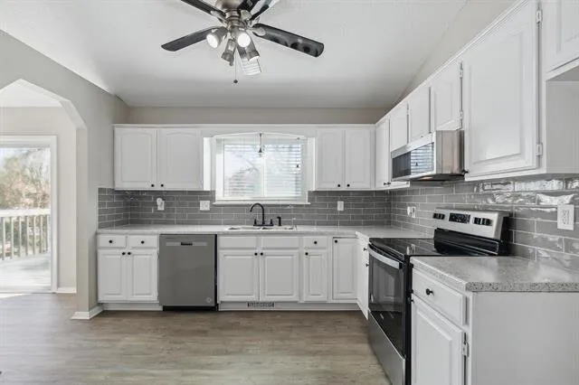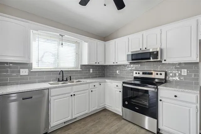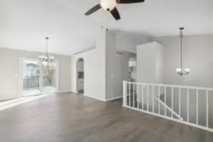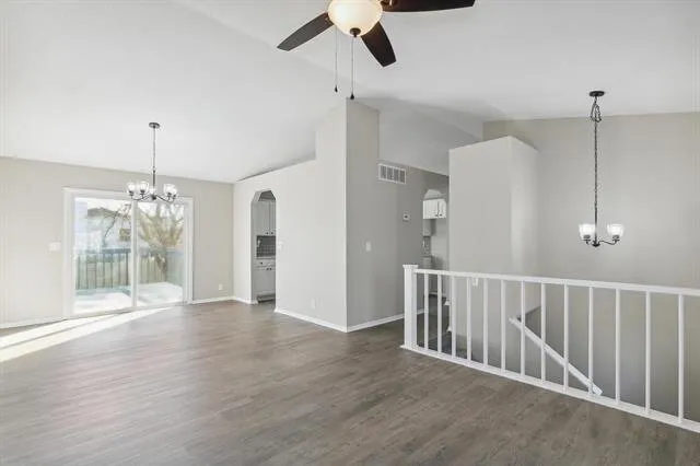 You will love the updates and space you’ll find within. As you approach, you’ll notice the stunning curb appeal, with a partial brick exterior, two car garage, and pretty blue front door. Step inside to find living areas graced by soaring vaulted ceilings and brand new luxury vinyl flooring throughout. The living room features a cozy fireplace, perfect for cooler evenings. The adjoining dining room has sliding glass doors that open to the back deck, ideal for indoor-outdoor entertaining. The contemporary kitchen boasts stylish white cabinets, sleek subway tile backsplash, gleaming granite counters, and stainless appliances that are all included. Notice the brand new carpet in each of the bedrooms. The spacious master offers an en suite bath, plus there’s an additional bedroom and bathroom. Head downstairs and you’ll find a family room with bright view out windows and space for a home theater and even a pool table or gaming area. There’s also a third bedroom and third bath, making this space ideal for a guest’s quarters or second master suite. This home gives you so much space to spread out. It’s also conveniently located close to parks, restaurants, and quick highway access, making your commute a breeze.