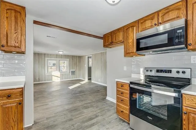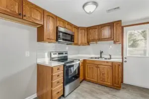 Pull up the front driveway and you’ll instantly feel at home in the quiet, country-like setting. The front porch and patio offer space for a seating area – the perfect spot for enjoying your morning coffee or evening beverage of choice. Head inside and you’ll find a living room that’s open to the kitchen and dining areas, making this an excellent layout for entertaining. Notice the new luxury vinyl flooring and new carpet as you tour the home. The kitchen offers ample cabinet space, sleek subway tile backsplash, and stainless appliances that are included with the home. There are also two bedrooms, both with sizeable closets, plus a full bathroom. Out back, the huge yard offers mature landscaping and so much space for outdoor activities. You’ll also be located near quick highway access, making the heart of Haysville (with tons of amenities) just a short drive away.